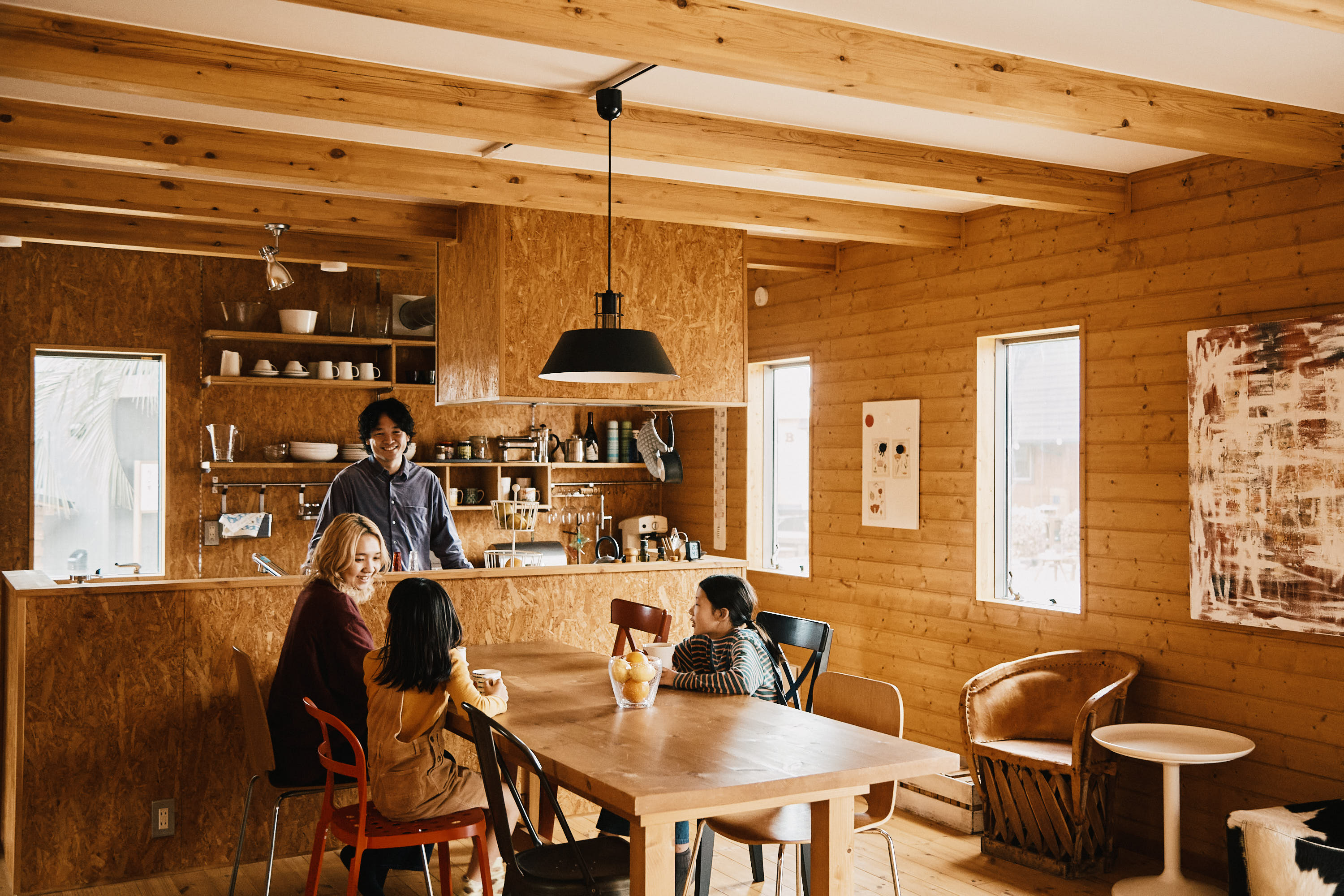 薪割りから着火まで、意外と簡単な薪ストーブ。着火後はあたたまった木の家でゆったりくつろいだり、ゆらゆら揺れる炎を眺めたり。