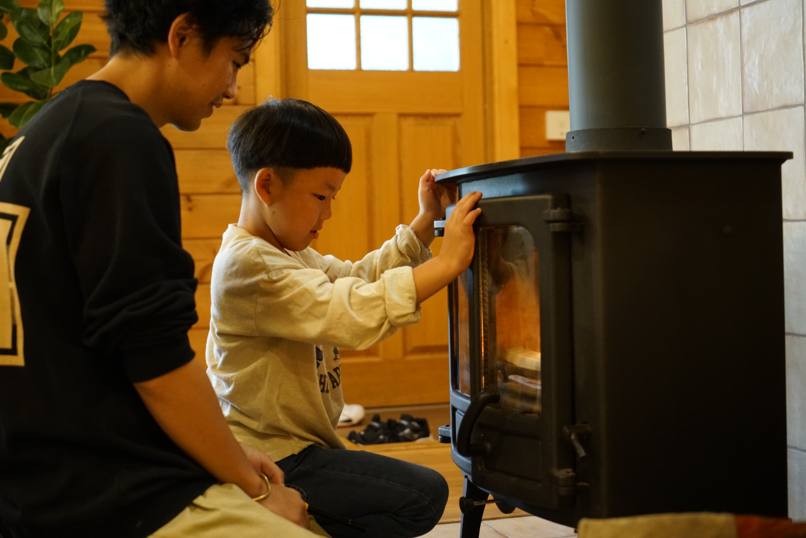 はじめて見る薪ストーブにワクワク!