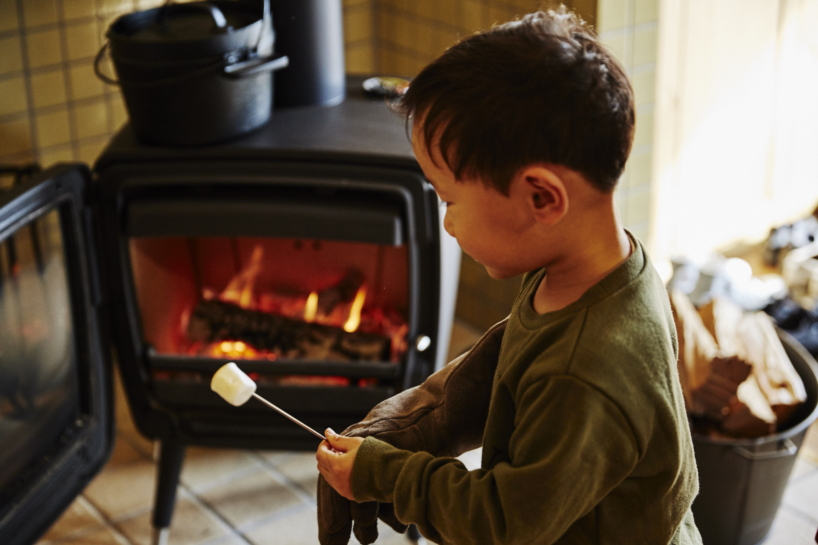 薪ストーブでマシュマロを焼いたり、